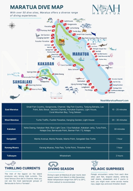 潛水區域包括:Maratua 馬拉圖、Sangalaki 聖加拉奇、Kakaban 卡卡班島、Karang Muaras 或 Talisayan(依當天氣候和海況調整)。