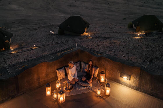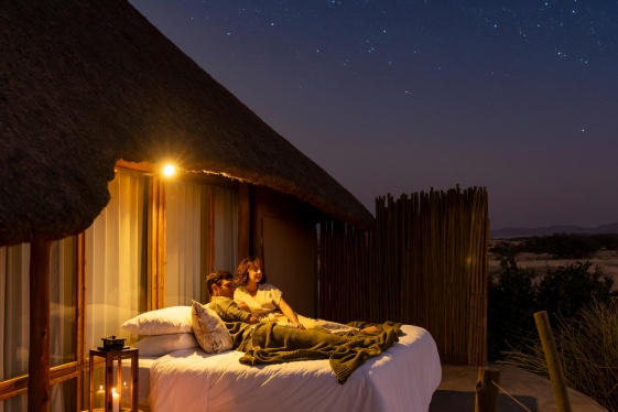 Wilderness Doro Nawas 坐落於岩石露頭之上,可遠眺自 Huab 河以北綿延展開的 Etendeka 山群,視野遼闊而震撼。營地設有 16 間以帆布與茅草構築的雙人客房,皆配備獨立衛浴。每間客房均建於架高的木質平台之上,並以碎石小徑與主建築區域相連,巧妙融入原始荒野之中。房內床鋪特別設計為可滑動式滾輪結構,夜晚可將床鋪推至露台,在無垠星空下入眠,沉浸於浩瀚銀河鋪展的靜謐與壯麗,帶來難忘的沙漠星宿體驗。